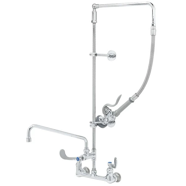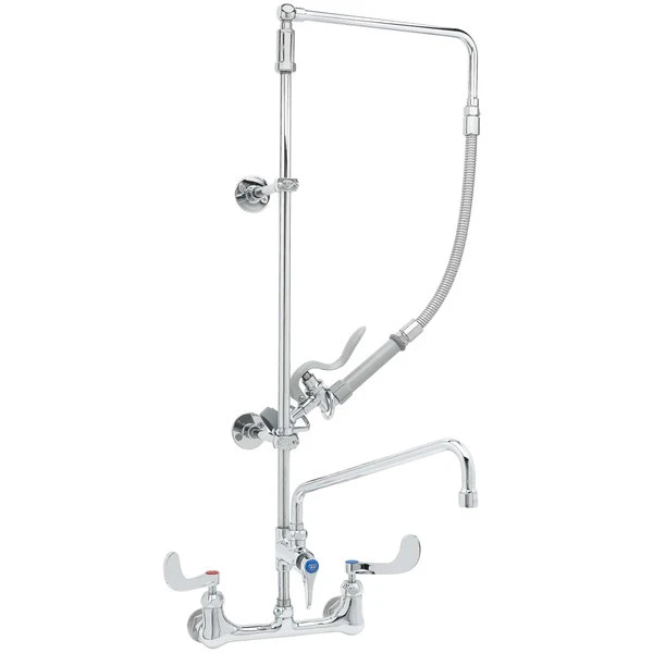 T&S Brass And Bronze Works T&S B-2466 Wall Mounted 33 9/16″ High Pre-Rinse Faucet With Adjustable 8″ Centers, 4″ Wrist Action Handles, Swivel Arm, 20″ Hose, 12 1/16″ Add-On Faucet, And 6″ Wall Bracket