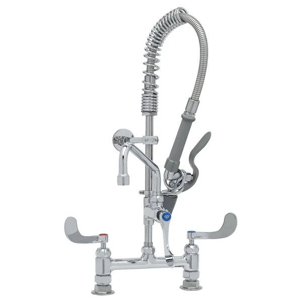 T&S Brass And Bronze Works T&S MPY-8DWN-08-CR EasyInstall Deck Mounted 24 3/4″ High Mini Pre-Rinse Faucet With Adjustable 8″ Centers, Low Flow Spray Valve, 4″ Wrist Action Handles, 24″ Hose, 8″ Add-On Faucet, And 6″ Wall Bracket